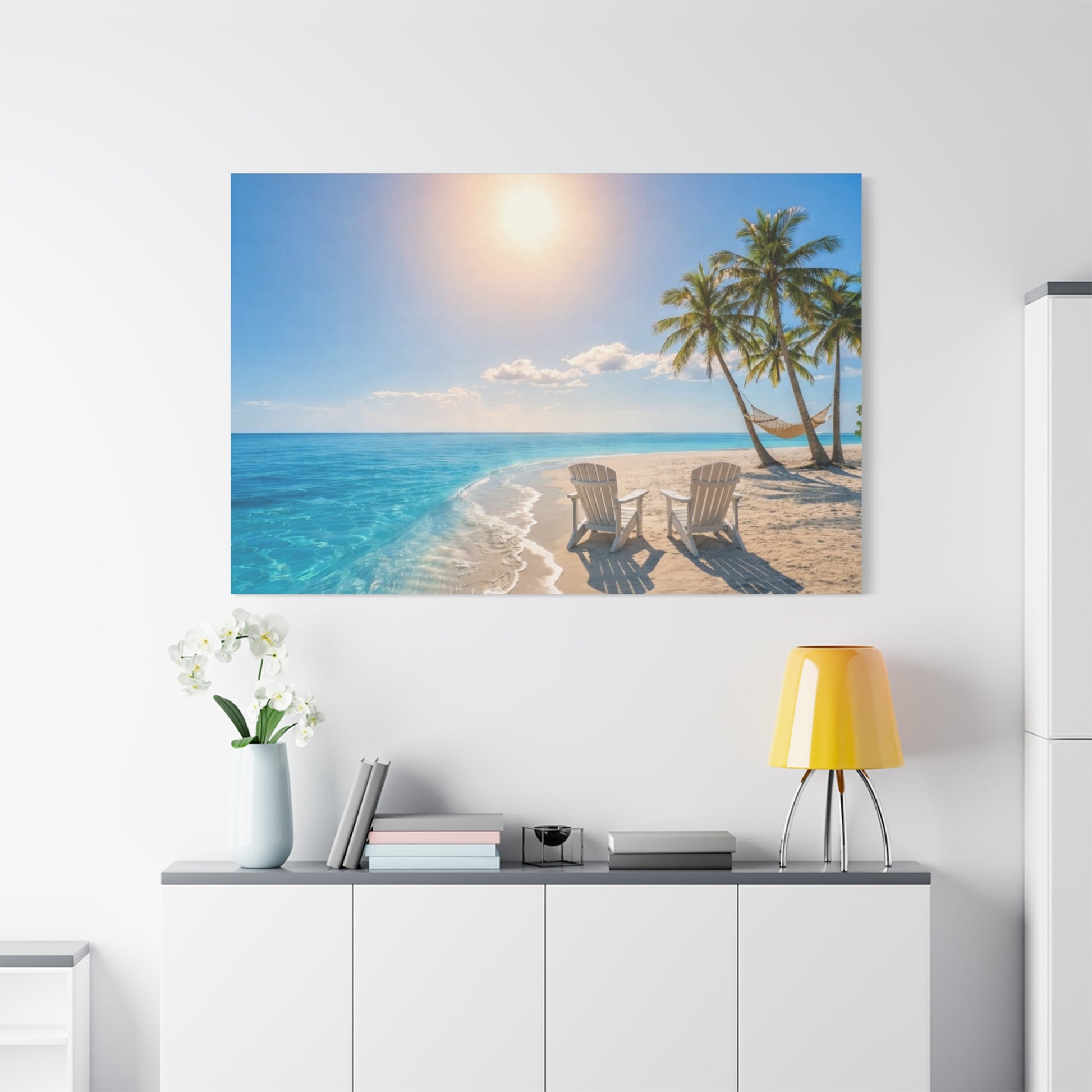 Late afternoon light warms a quiet shore. Two Adirondack chairs and a hammock face the blue ocean, the sun hanging low and gentle over white sand. This stretched matte canvas captures that hush — the slow, salty breath of a beach afternoon where conversation drifts and time loosens its grip. Hang it above a reading nook, over a mantel, or in a sunlit hallway to bring a coastal pause into daily life. The image feels lived-in, like a memory you can step into: bare feet in warm sand, the sway of a hammock, and a small, steady calm that settles over whatever room you place it in.