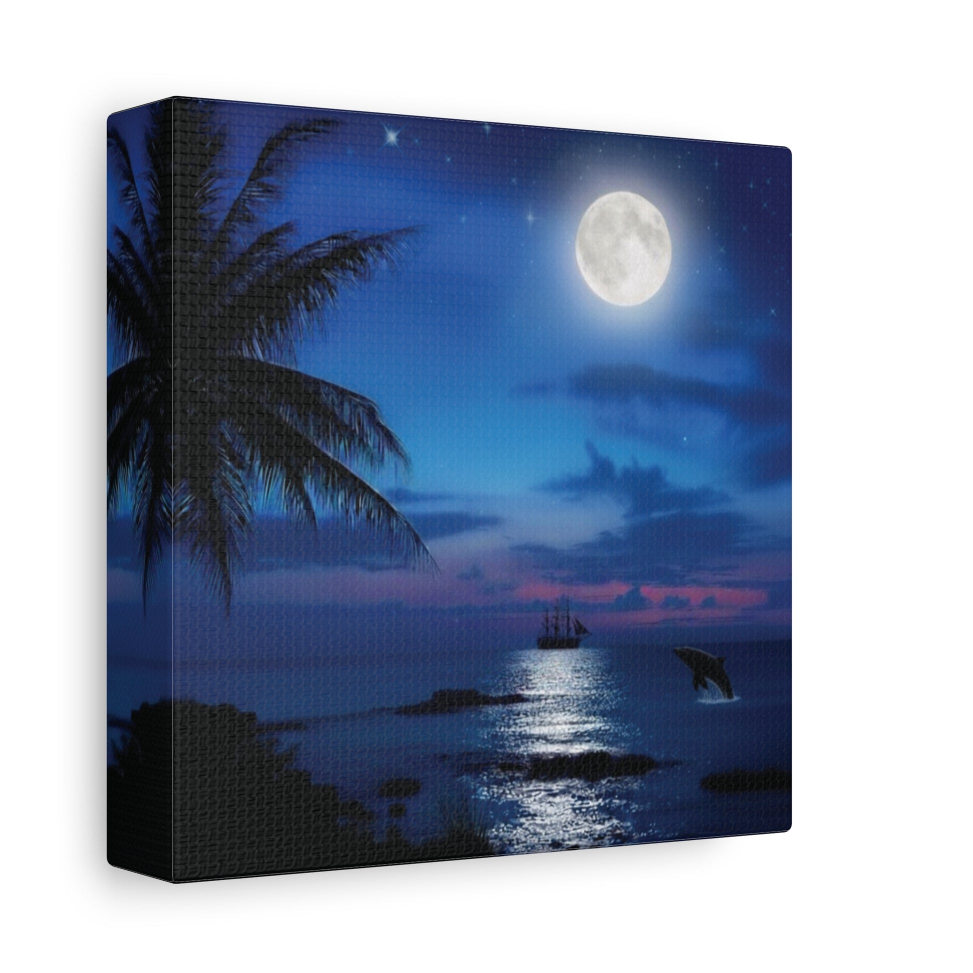 This serene landscape captures the magic of a tropical night. A majestic full moon casts a shimmering reflection across the calm ocean waters, while a tall ship sails gracefully in the distance. Above, a scattering of twinkling stars adorns the deep blue sky, and a whale playfully breaches far off in the tranquil sea. Palm fronds frame the scene, inviting viewers to a peaceful, dreamlike escape.