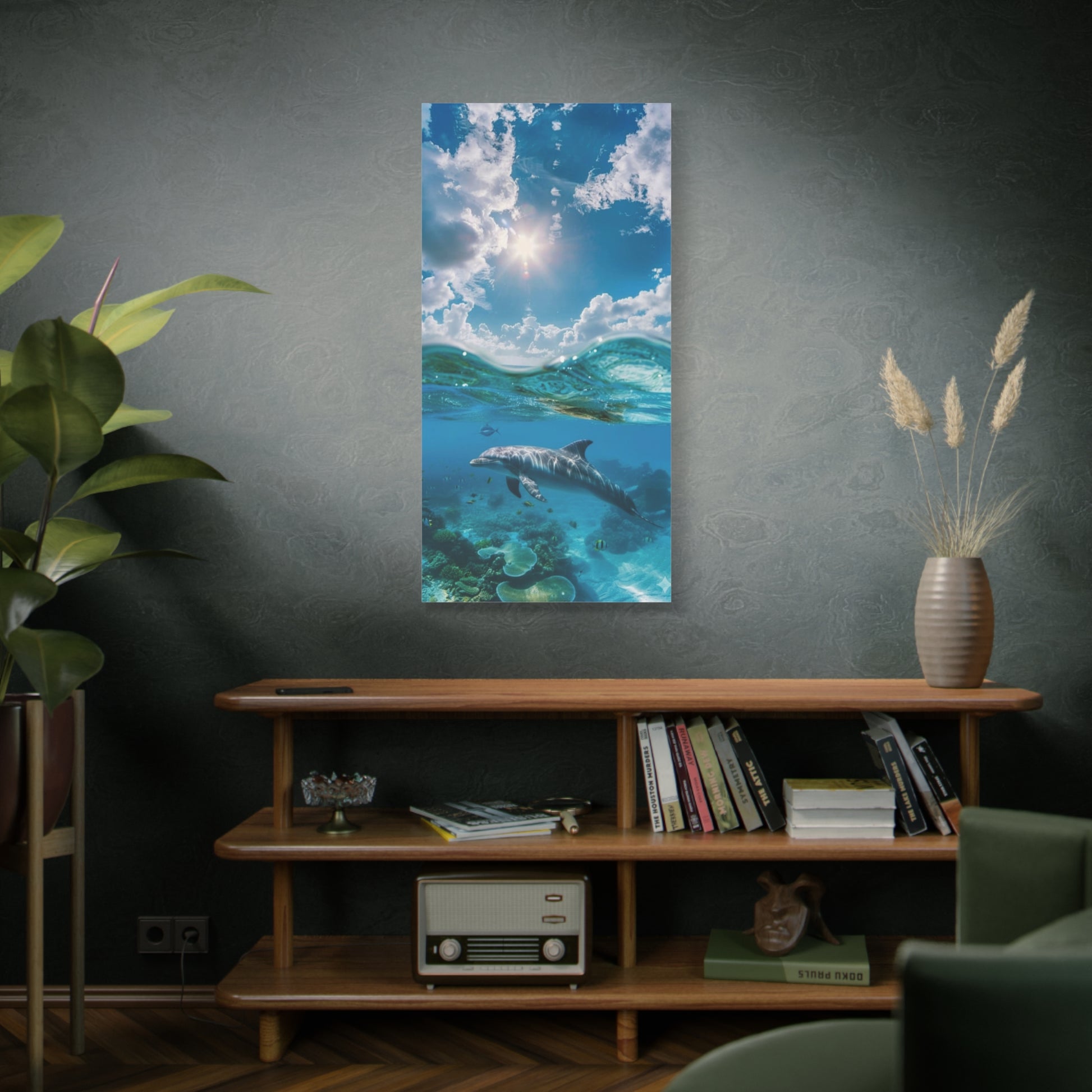 Dive into a quiet underwater moment with this matte stretched canvas, where a playful dolphin glides through soothing blue currents. The image feels calm and alive — soft light filtering down, bubbles tracing the dolphin’s path, and the gentle motion of the sea captured in rich, fade-resistant inks. Hung in a hallway, nursery, or seaside-themed room, the canvas brings a sense of ocean-breath and gentle joy to everyday life. Lightweight yet sturdy, it arrives ready to hang and sits flush against the wall, anchored by discreet rubber dots that keep it steady. The natural pine frame and matte finish let the artwork speak softly, inviting viewers to pause and remember the hush of the deep.