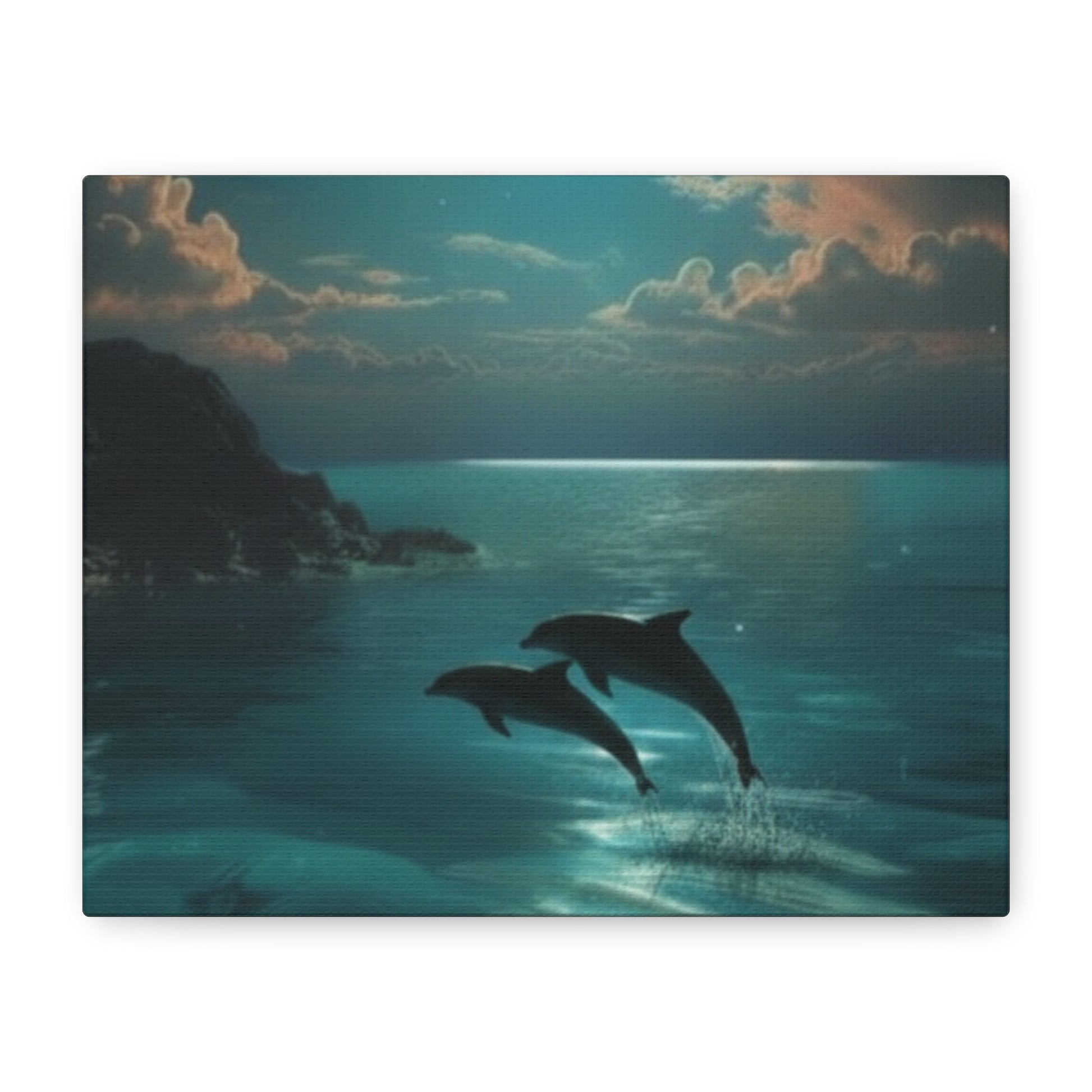 Dive into tranquility with this peaceful dolphins canvas. Playful dolphins in turquoise moonlit waters create a serene atmosphere perfect for bedrooms, bathrooms, or any space where you want to feel the soothing energy of ocean wildlife.