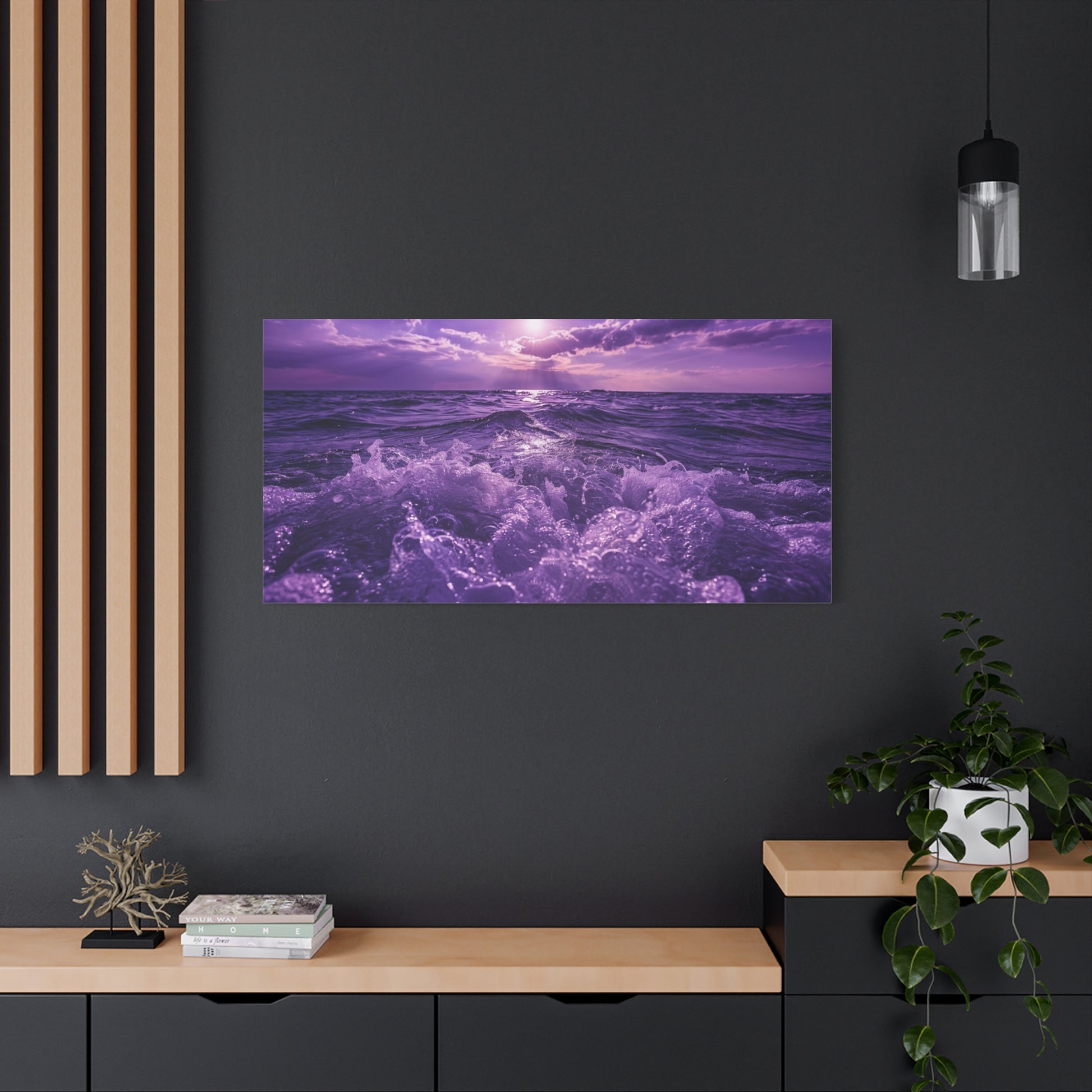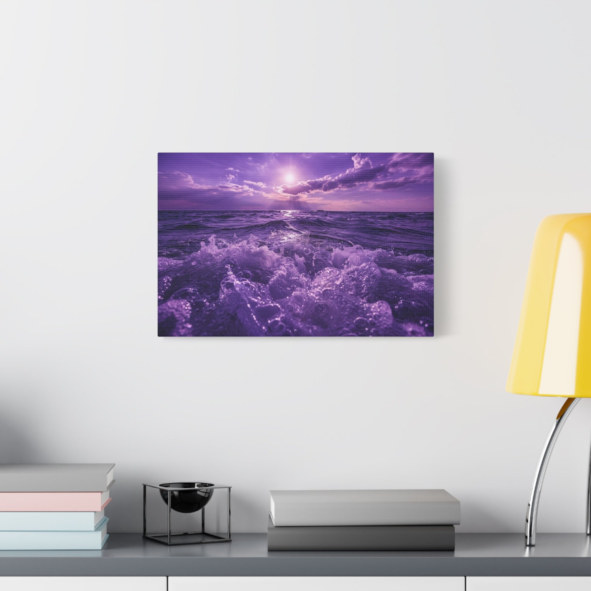 A stretched matte canvas that brings a purple-hued sunrise over an ocean into your room. The muted matte finish softens light, letting gentle purples and warm dawn tones sit like a memory on textured cotton-poly canvas. Hung above a bedside, over a reading nook, or leaning against a mantel, the piece feels like the first breath of morning after a long night—still, hopeful, and quietly vivid. The subtle texture of the canvas and the deep, velvety purples invite closer looks; the coastal sunrise mood slips easily into spaces that favor calm palettes, slow mornings, and thoughtful interiors. Mounted on a slim 1.25" pine stretcher, it reads like an intimate window to the sea rather than loud wall art, and the soft rubber supports and included hanging hardware make placement effortless for someone curating a tranquil home or a seaside-themed room.