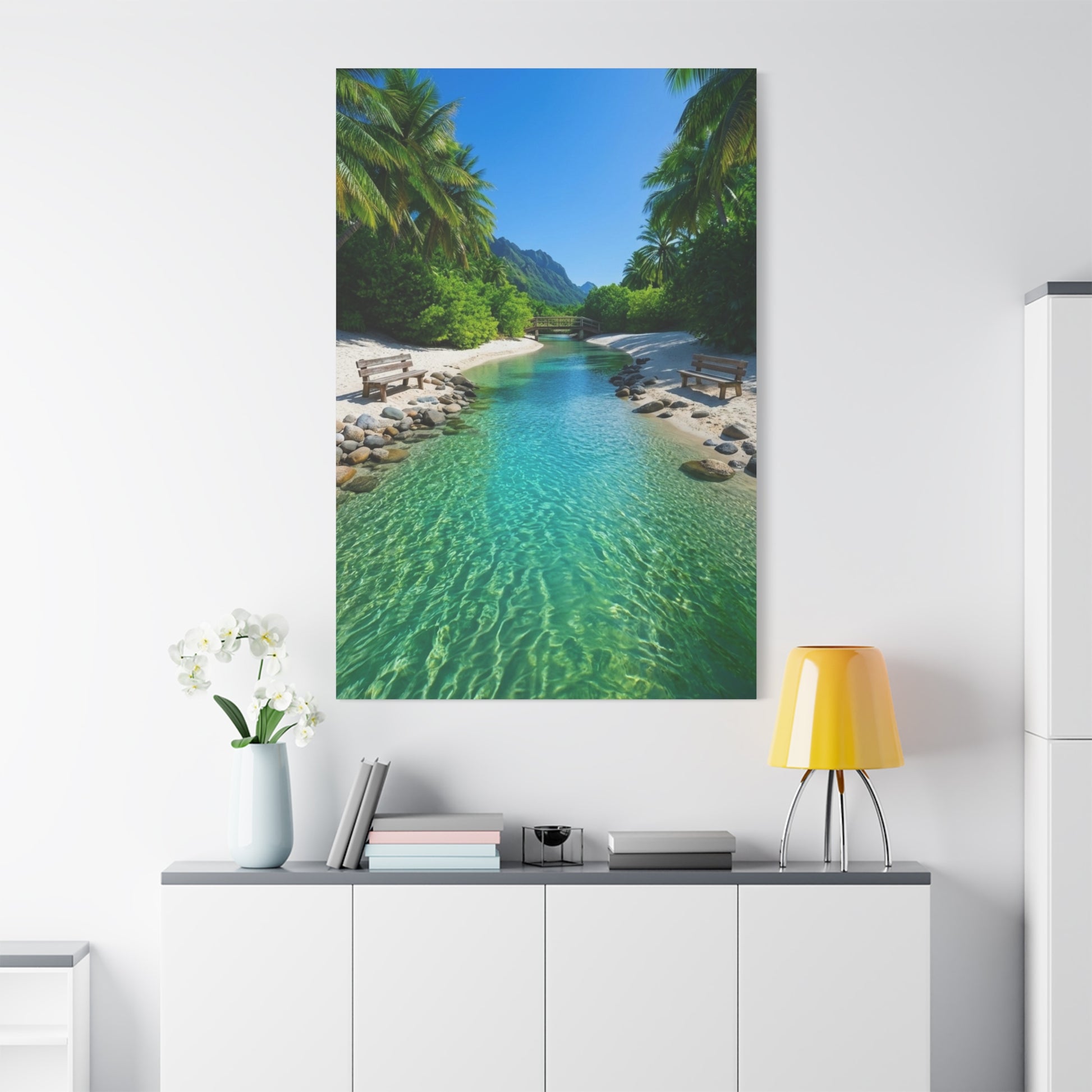 Sunlit turquoise water laps at a white-sand shore captured in vivid, painterly detail. This stretched matte canvas brings a calm, coastal pause to any room—like a window to a quiet beach day. The texture of the canvas and the muted matte finish keep reflections low and color depth rich, so the sea’s blues and sandy highlights feel natural and tranquil. Lightweight yet sturdy, it hangs flush on the wall and stays steady thanks to small rubber feet at the bottom. For someone who collects quiet travel memories or wants a serene backdrop for a reading nook, this piece adds a breath of ocean air without shouting for attention.